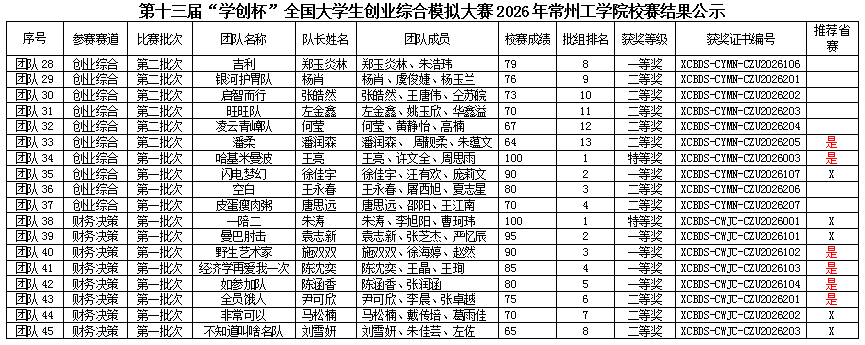 根据《关于举办第十三届“学创杯”全国大学生创业综合模拟演训活动江苏省选拔赛的预通知》要求,我校先后组织的创业综合模拟、数字营销模拟、财务决策模拟赛项等三个赛项的校内选拔赛,分别采用《创业之星》等软件模拟综合评分。全校组织45个团队参加校赛,共评选出特等奖、一等奖、二等奖等若干名。根据学生自愿原则和校赛综合成绩排名,每一个赛道推荐不超过5支团队参加江苏省赛,具体名单如下表。