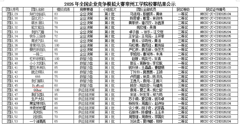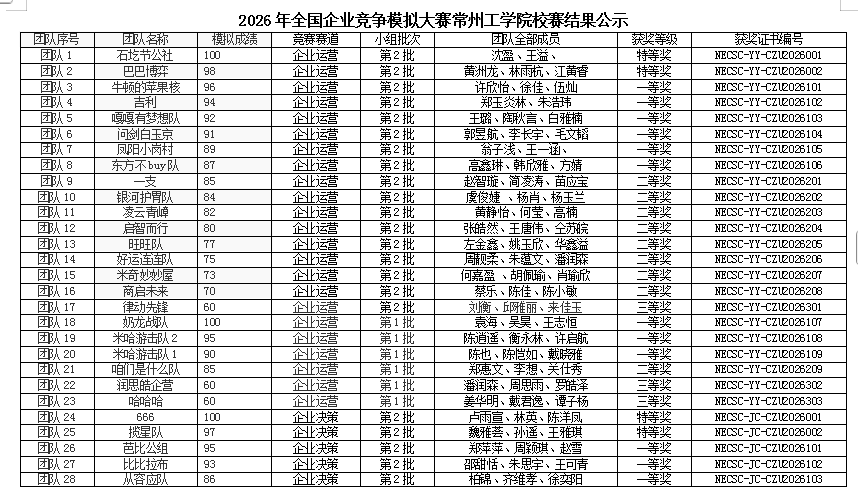 根据《关于我校组织2026年全国企业竞争模拟大赛的通知》要求和《2026年全国企业竞争模拟大赛通知与规程》文件精神,我校组织了全国企业竞争模拟大赛企业决策、企业运营、供应链决策模拟、数智沙盘模拟赛道的校内选拔赛,评选出了特等奖、一等奖、二等奖等,并择优推荐参加全国复赛,具体拟获奖名单如下。